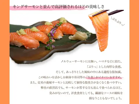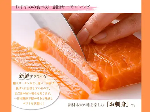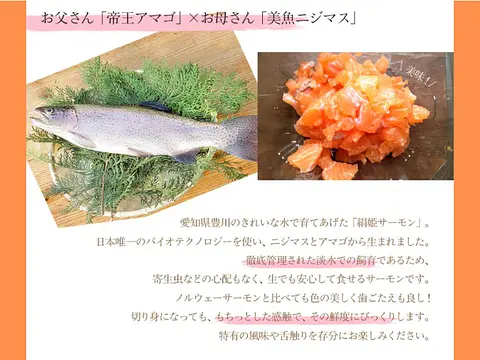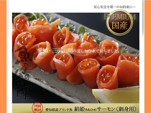 愛知県のブランド魚・絹姫サーモンは、魚屋がイチオシする「サーモンが苦手な方にこそ召し上がって頂きたい」魚です。サーモン独特の臭みがなく、食感もプリプリ♪生食用でお召し上がり頂けます。 内臓だしをした後、ラウンド(頭付き)でお届けします。 捌きを楽しみたい方におすすめです。