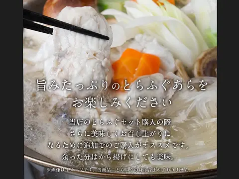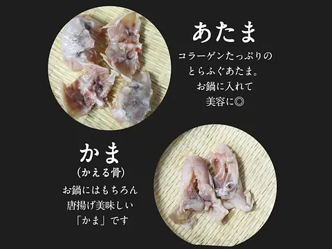 ふぐ鍋商品と一緒に買っていただけますと美味しいふぐ鍋が出来ます。 部位は加工状況により異なります。全ての部位が入るわけではありませんのでご了承ください。 部位のご指定はお受け致しかねます。